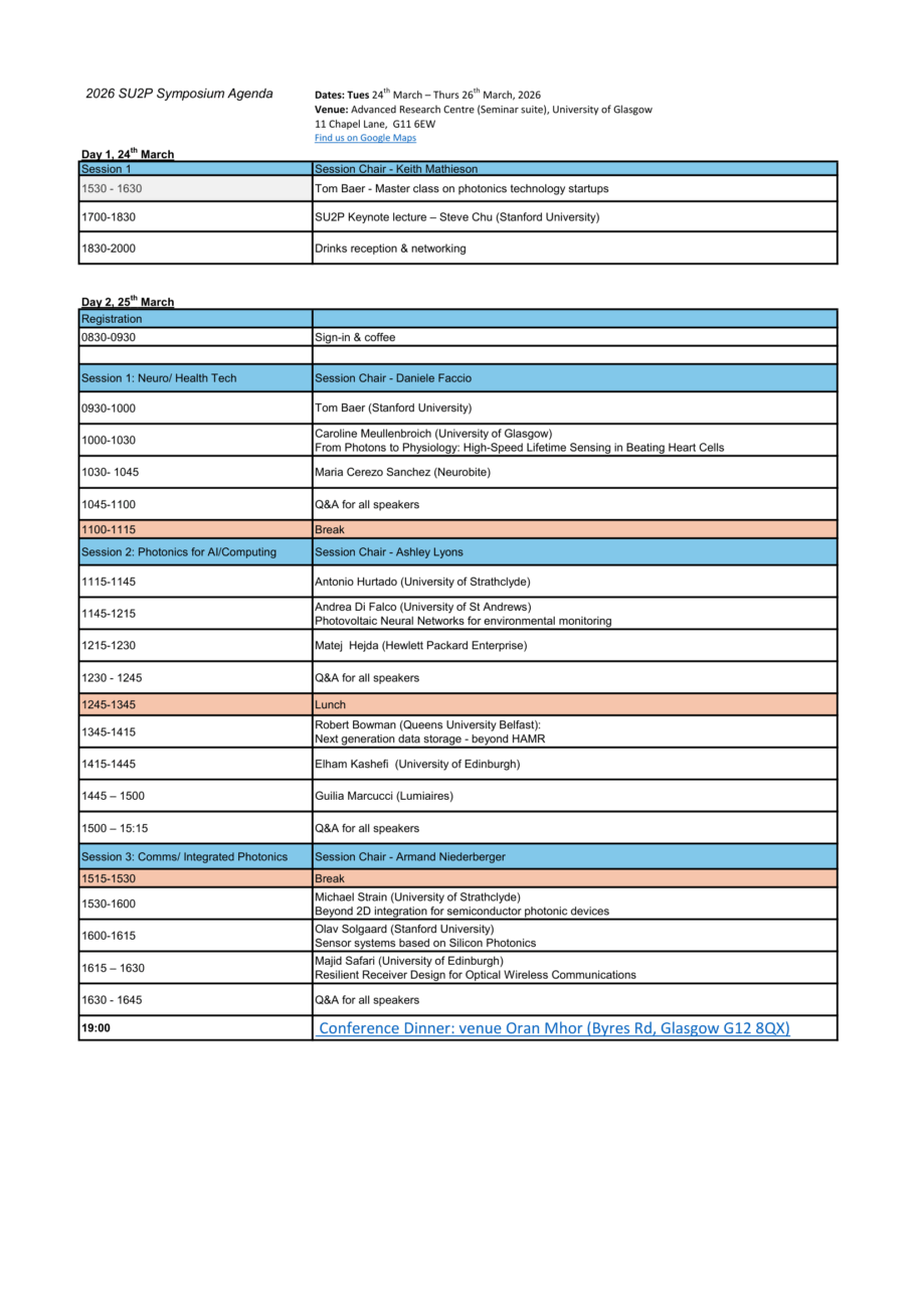 We are delighted to announce the SU2P symposium, which will bring together academic and industry partners from the Scottish and Stanford photonics communities and seek to build on the collaborative opportunities.
